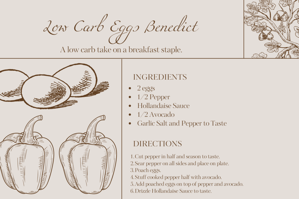 For this particular recipe, you’re going to copy everything in the original except for the bread. Instead of bread I substituted a half a bell pepper which I sprinkled garlic salt and fresh cracked pepper onto before searing it on all sides in a pan with olive oil. Once seared you can add into the pepper half fresh avocado or if you’re like my partner, ham and avocado. Then you just top with your poached eggs and freshly made hollandaise sauce and you’re ready to serve!